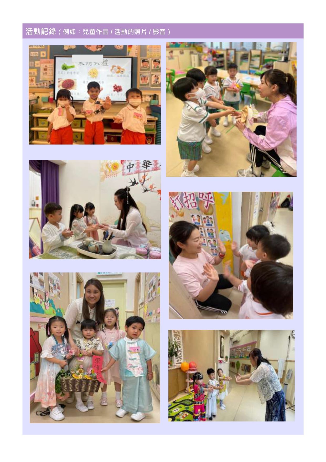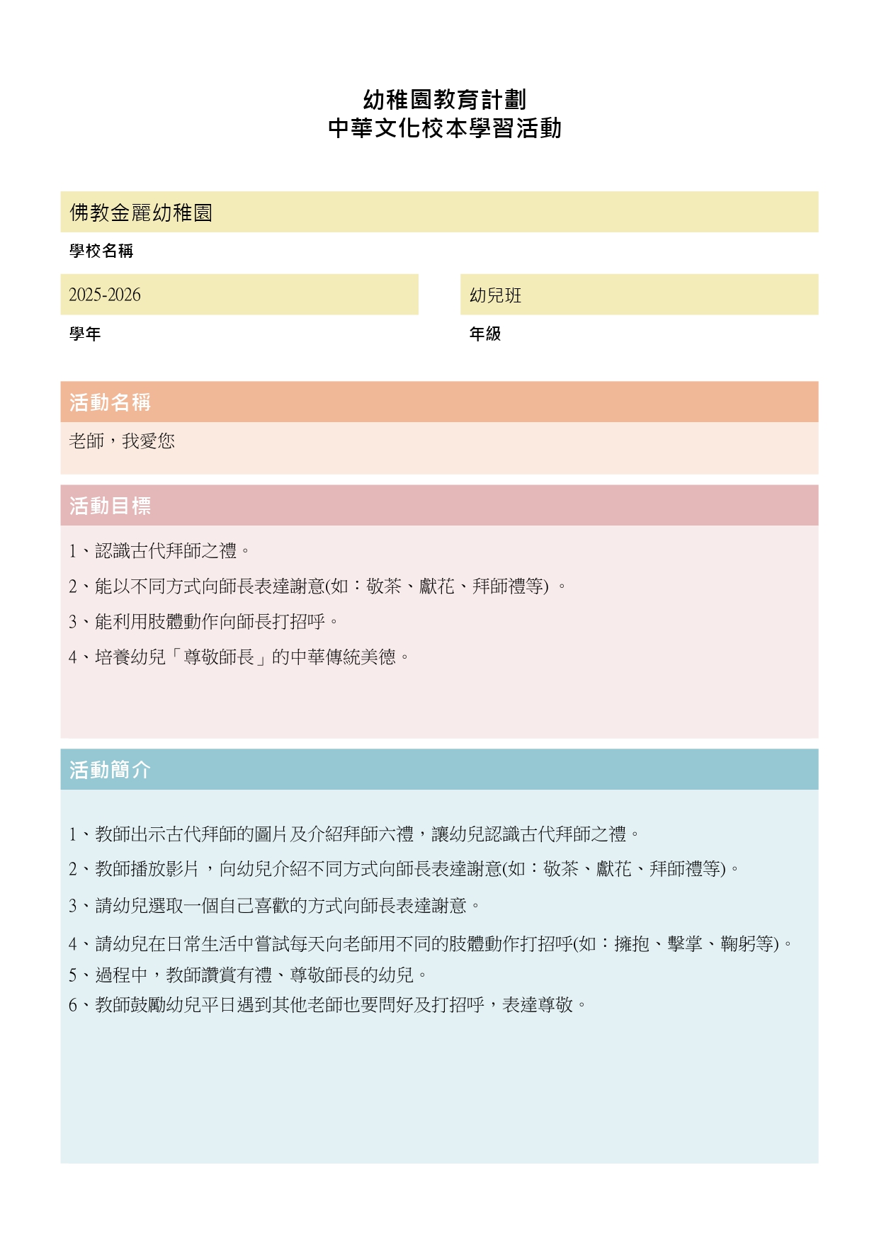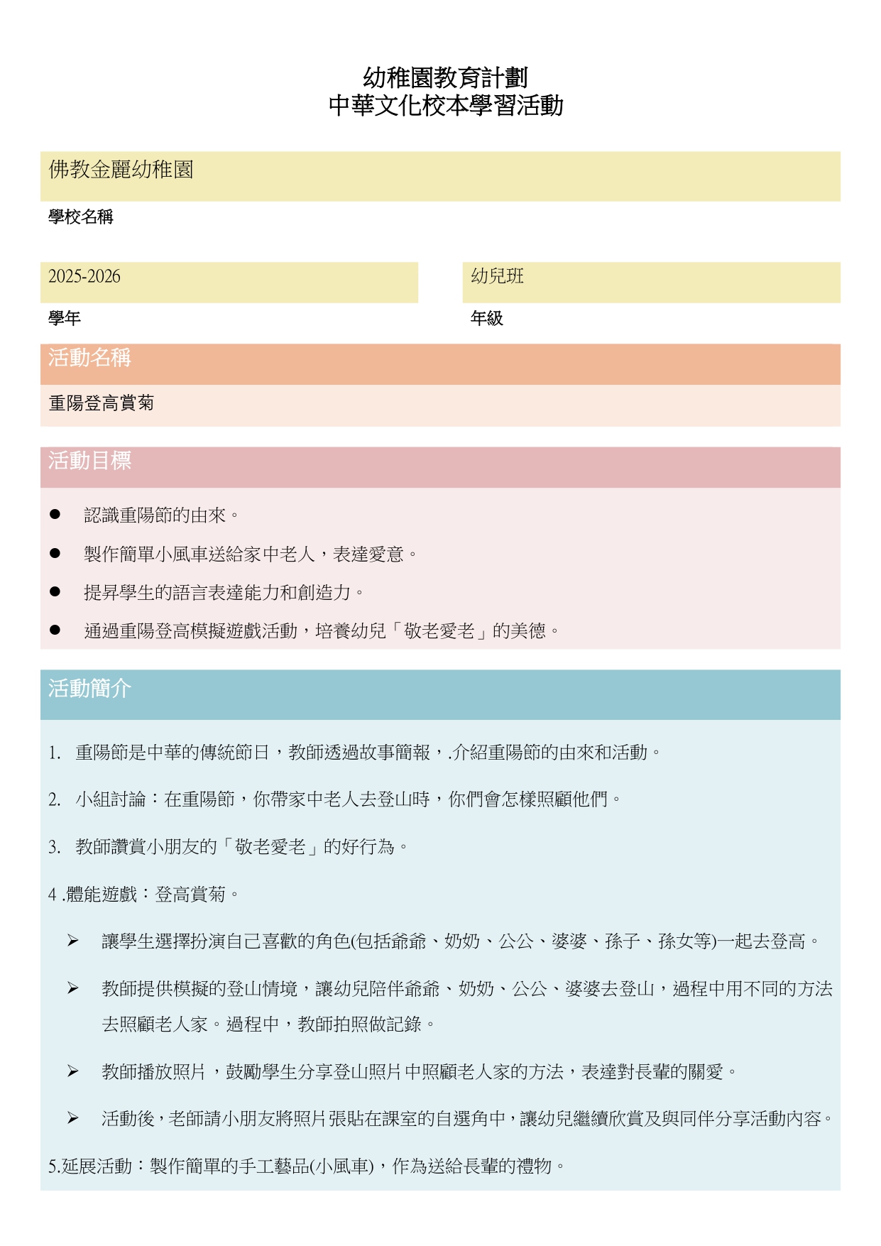 2025-2026年度 2025-2026年度 24-25高班中華文化活動「中秋節」(10月) 25-26低班中華文化活動「溫馨老幼親一親」(10月) 25-26年度幼兒班中華文化活動「重陽賞菊」(10月) 24-25高班中華文化活動「參觀中國藝術廊」(9月) 24-25低班中華文化活動「象形文字樂悠悠」(9月) 25-26幼兒班中華文化活動「老師,我愛您」(9月)